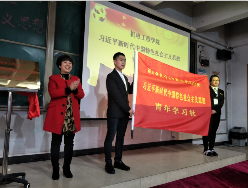 在成立仪式上,青年学习社负责人和委员分别宣读了社团章程和第一届组织机构名单,学院党委负责同志为社团揭牌、授旗并做了讲话,从“学、研、传、行”等四个方面对全体社员提出了四点希望。希望全体社员要认真深入学习十九大报告原文,在学习过程中端正学习态度,摒弃各种装样子、走过场的学习心态,将报告原文学懂、记牢;在学习的过程中要融入自己的思考并与自己所学所长相结合,通过对国情和社情的研究分析,充分理解相关表述的科学性,通过研读、研讨等有效学习形式,深刻理解习近平新时代中国特色社会主义思想的科学内涵;通过各种宣传平台,创新传播方法和理念,采取学生喜闻乐见的方式和途径,用学生的话语体系传播,成为习近平新时代中国特色社会主义思想在科师校园传播的排头兵;要在充分理解习近平新时代中国特色社会主义思想科学内涵和精神实质的基础上,用实际行动积极践行十九大精神,潜心专业学习,积极参加社会实践和志愿服务活动,不断提升综合素质,丰实自己的羽翼,为将来投身社会主义现代化建设事业打下坚实的基础。