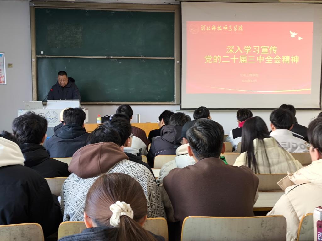 2024年12月6日下午,best365官方网站登录入口邀请了校思想政治理论教育宣讲团成员、马克思主义学院杜立文副教授宣讲党的二十届三中全会精神。宣讲会由学院党委负责同志主持,学院全体教职工、学生入党积极分子共160人参加。