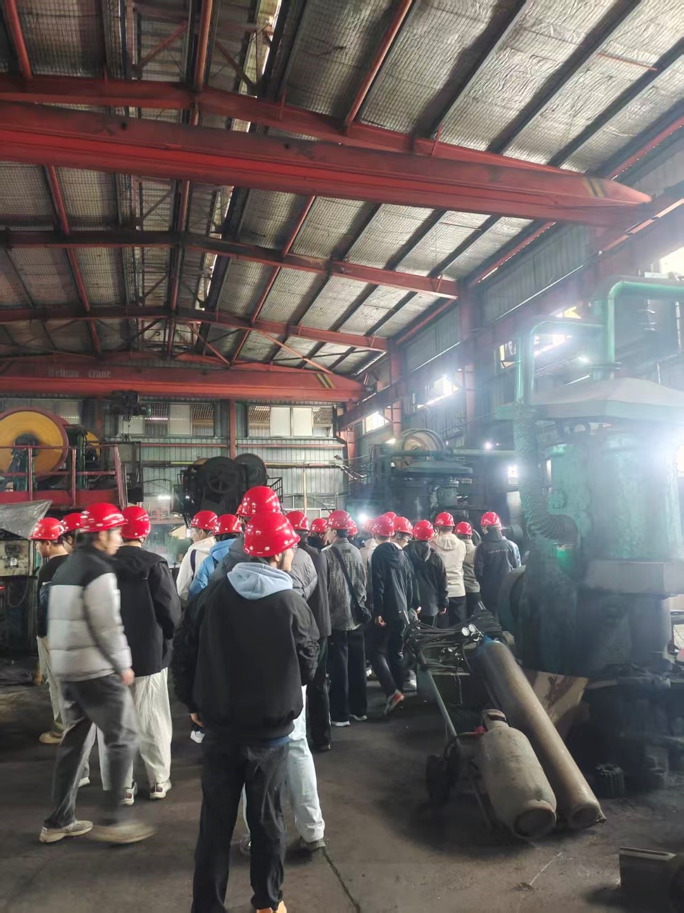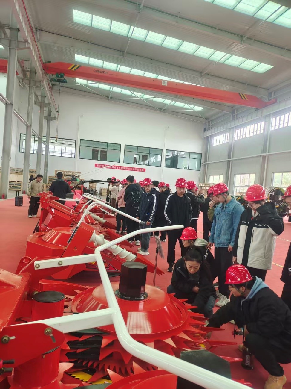 同学们先后参观了玉米秸秆青贮机割台、花生联合收获机、花生捡拾机以及农工具生产现场和鑫万达公司的智能仓储运行产线,近距离观摩了一系列现代化农机装备。企业工作人员为同学们详细地介绍了农机的工作原理和关键结构件的焊接制造工艺。高度自动化的现代农机装备令同学们深感震撼,而在农具锻造环节,目前仍以人工操作为主,尚未形成先进的自动化生产线——这也为同学们指明了未来技术攻关与创新的方向。